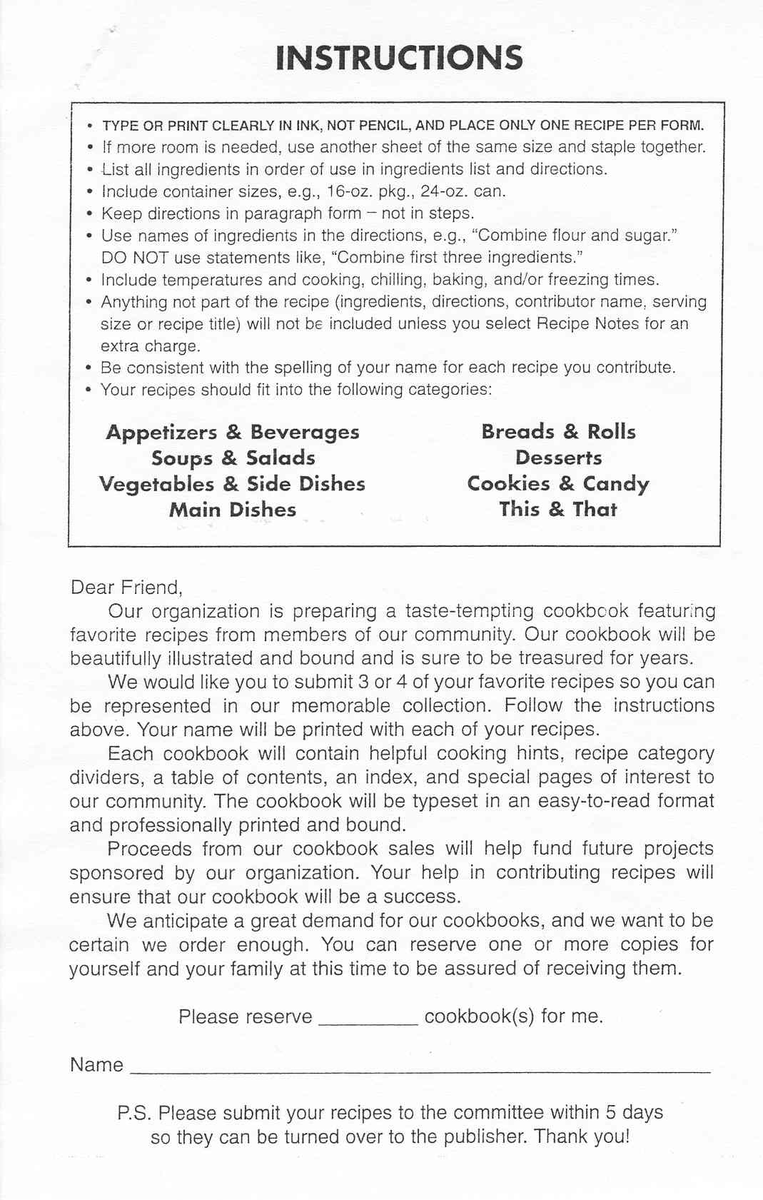 TO: All LGCF Members FROM,- Cookbook Chairmen Nan Hagger & Sharon Smith SUBJECT: Recipes for new cookbook With this letter, under the direction of our President, Margo Racca, we are 'kicking-off' this project to publish a brand new LGCF cookbook, entitled, "Cher', it's good, too!", and we are appealing to all LGCF members for assistance, participation and support. Each club will receive several blank recipe collection forms', but it will be up to the individual clubs to zerox the appropriate amount for their clubs, keeping in mind to reserve a blank form for this purpose, as we will be unable to furnish more. In addition to the regular catagories', there will be three 'new categories', as we believe a little new' mixed in with the old 'tried & true, will be an interesting asset to this new cookbook, These new categories are: