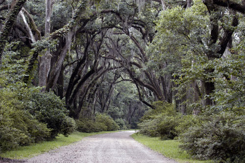 curved allee' of live oaks at Afton Villa in St. Francisville, Louisiana.